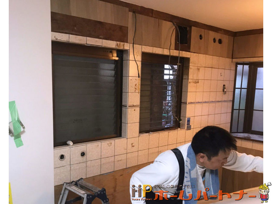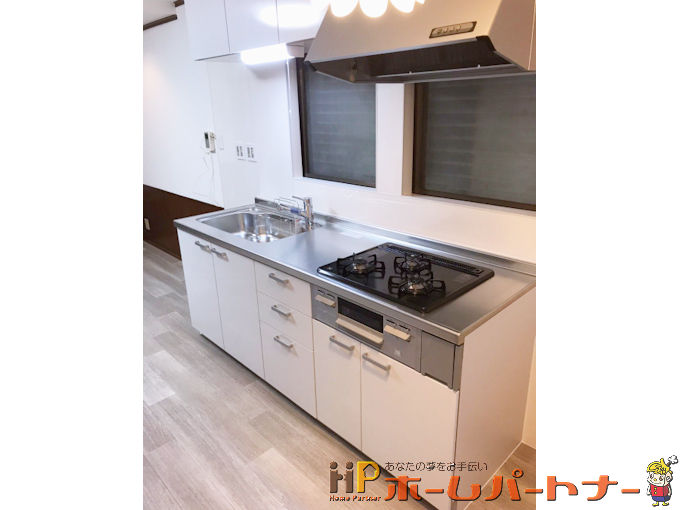 既存キッチン撤去 給排水移設接続 キッチンパネル貼り施工 キッチン本体設置