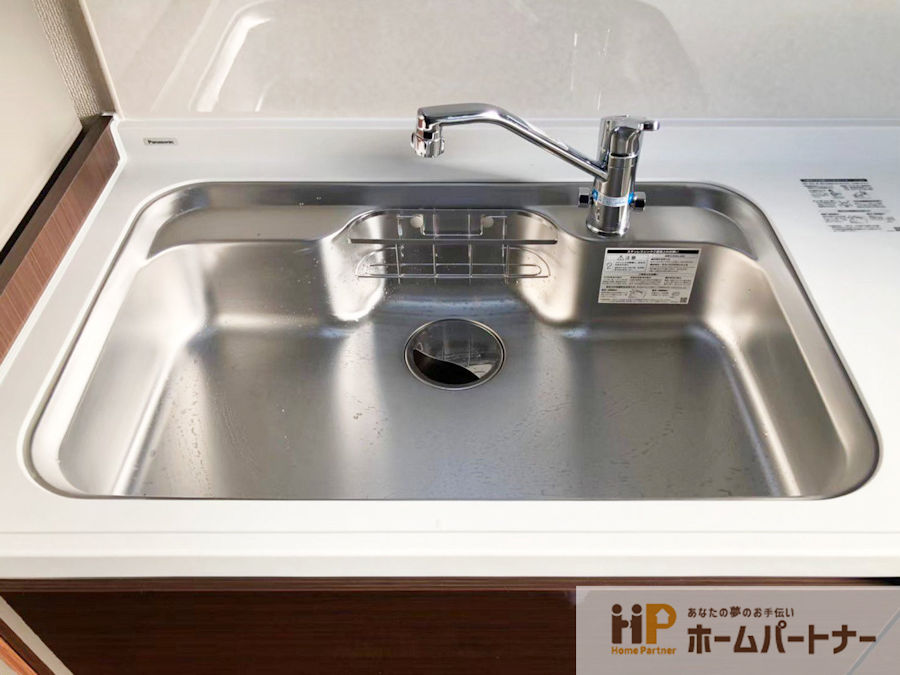 リフォーム施工後 シンクは、使い勝手の良い大きなスキマレスシンク ステンレスMタイプになりました。 付属品:洗剤ラック